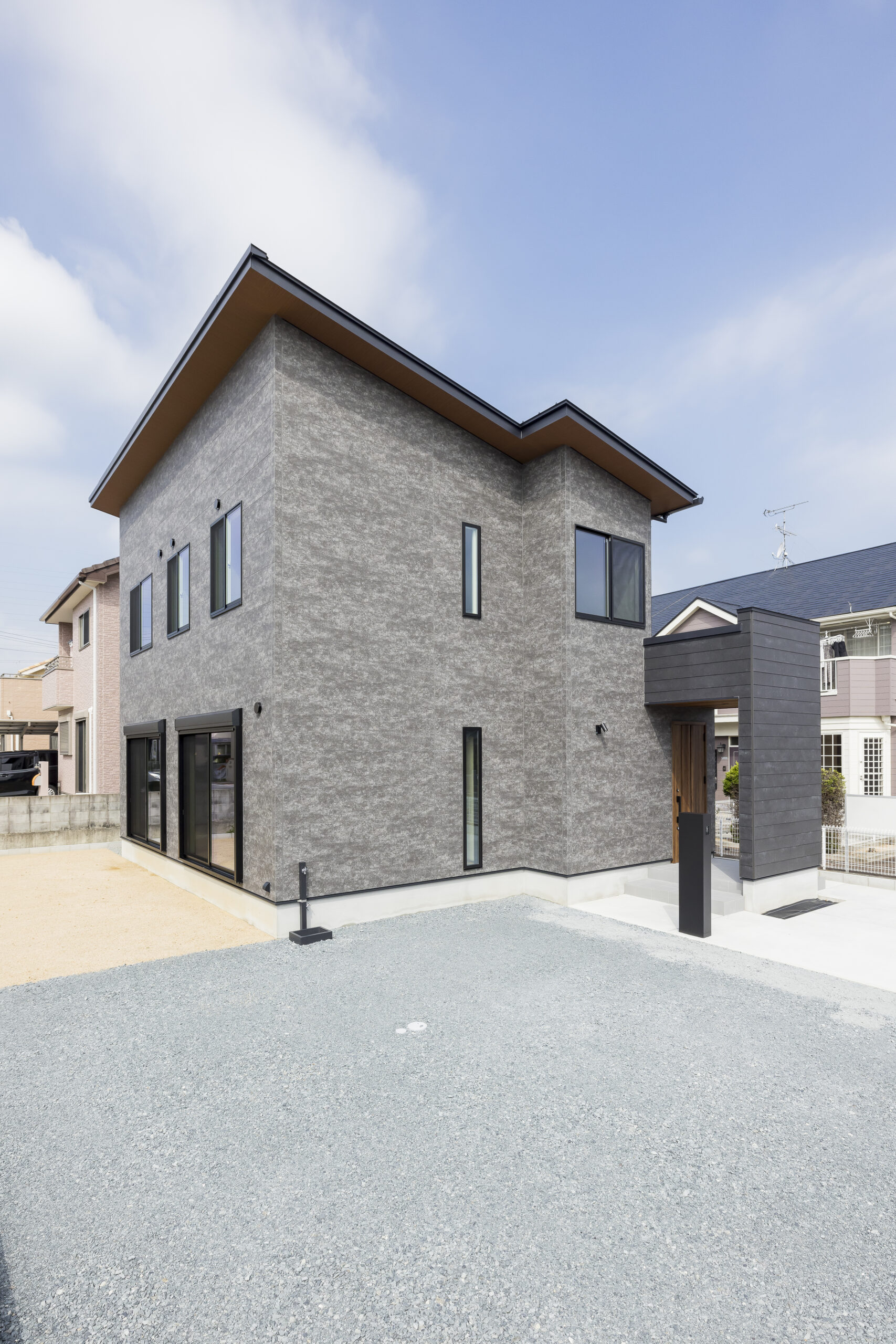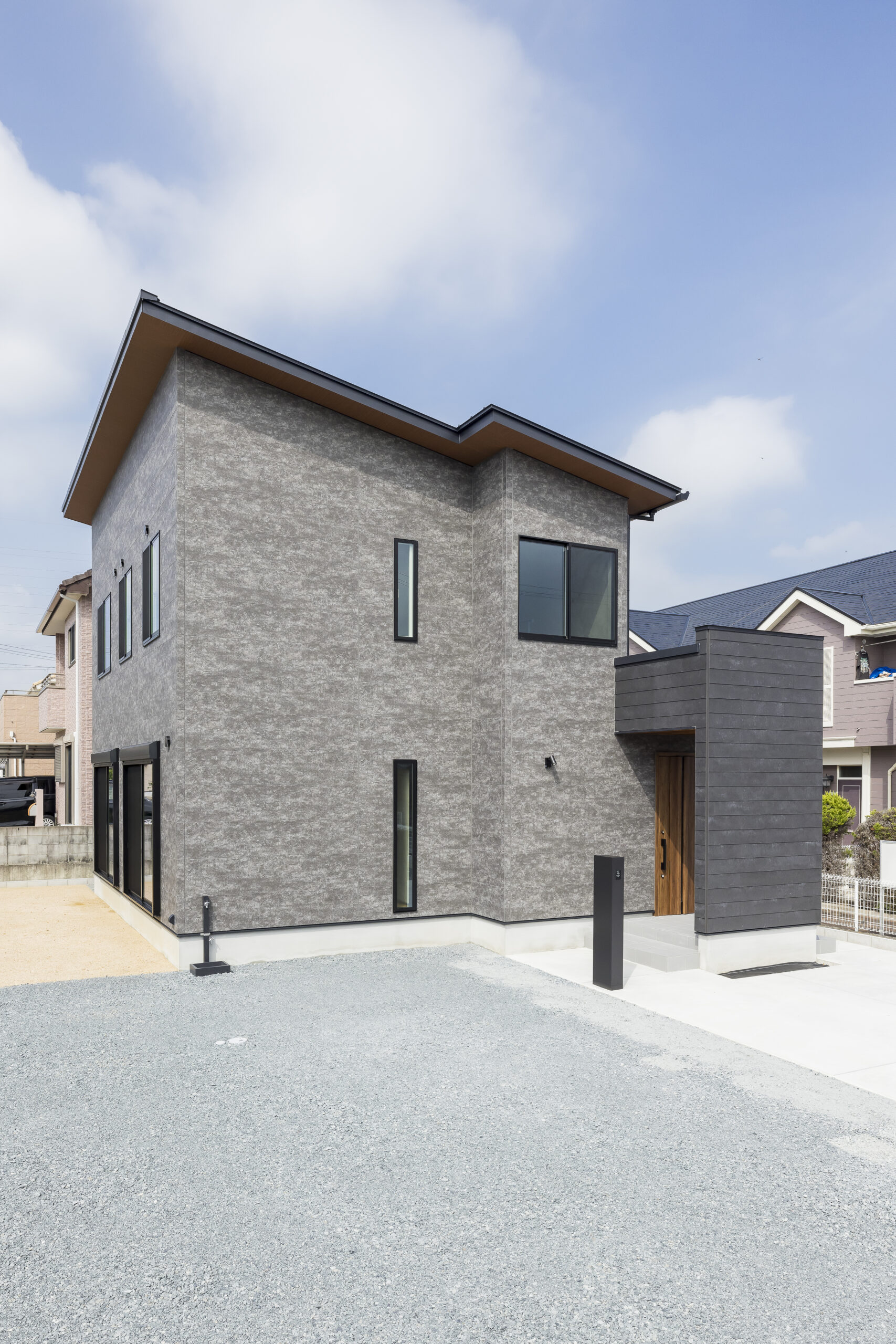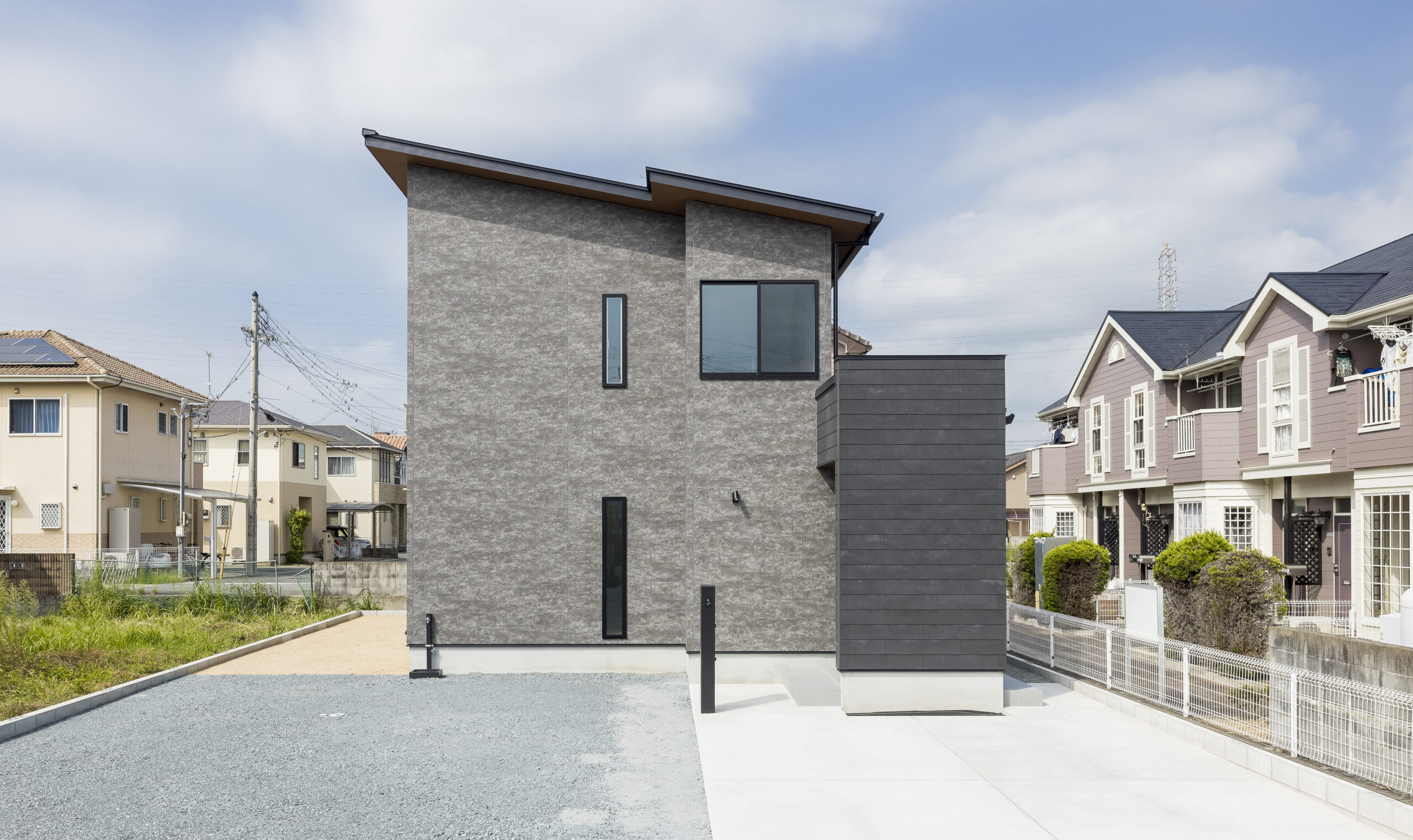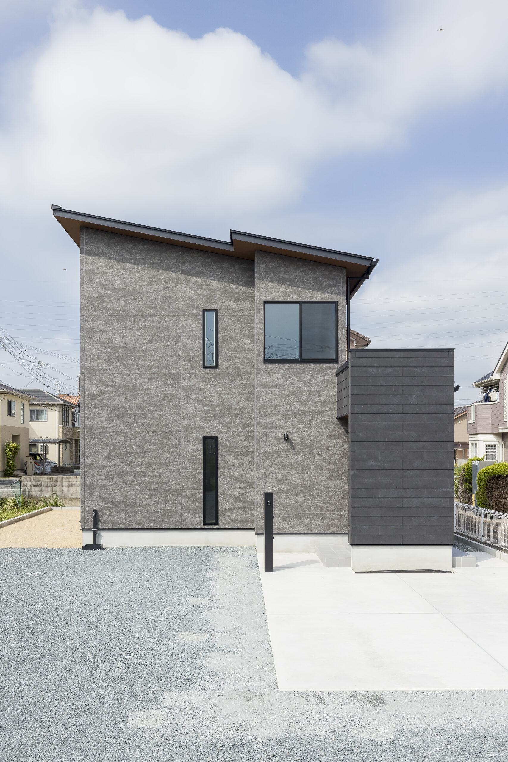 片流れ屋根とグレーの外壁が印象的な、シンプルモダンの住まい。外観は落ち着いた佇まいでありながら、縦長の窓や水平ラインがアクセントとなり、洗練された雰囲気を漂わせています。