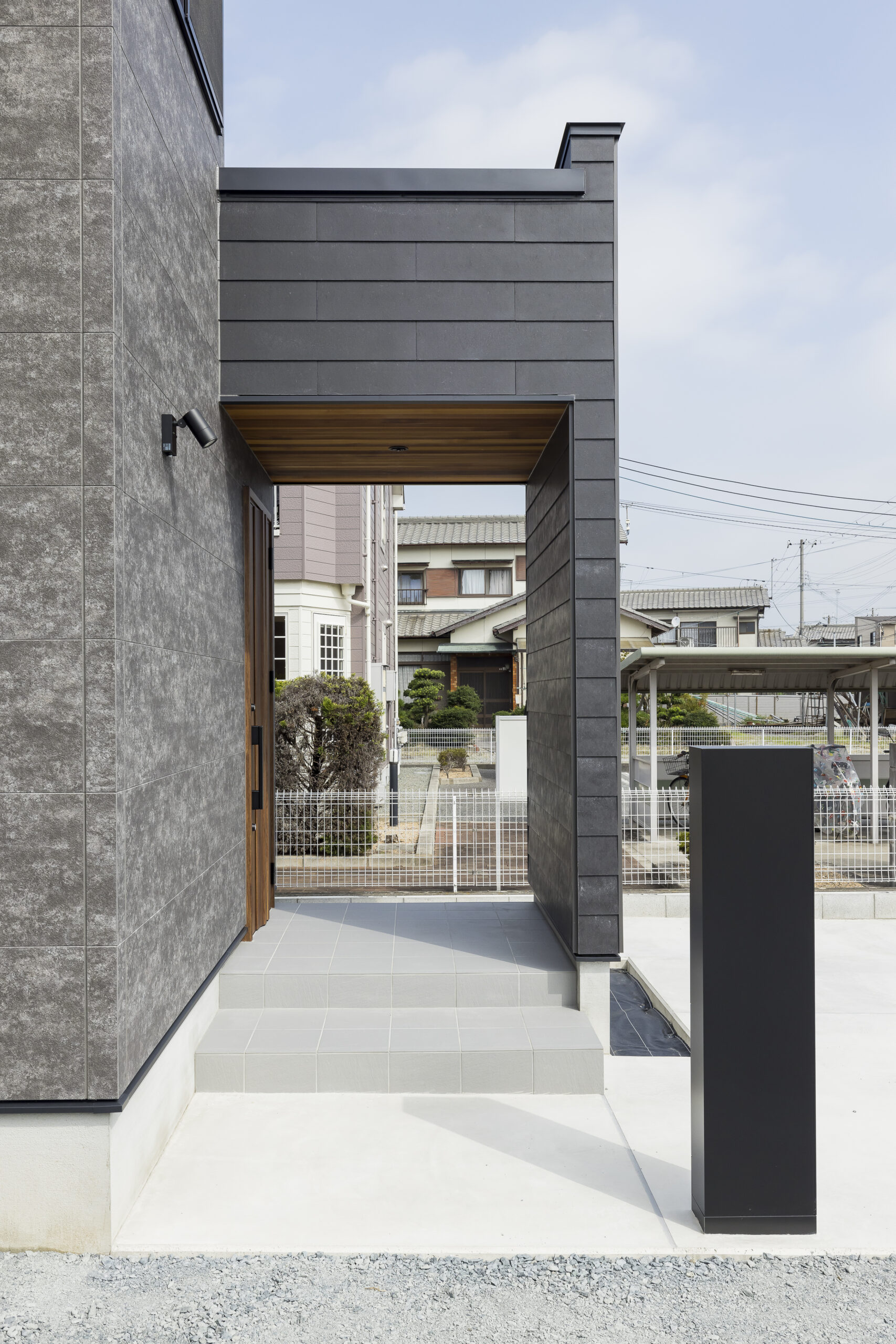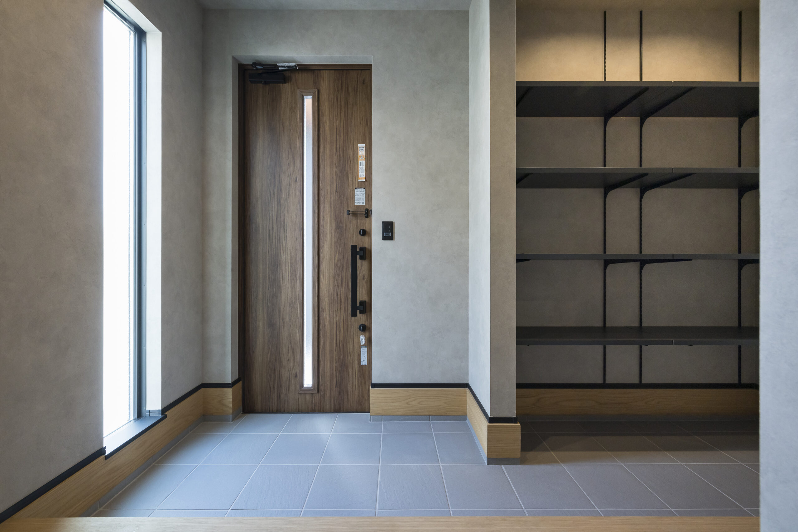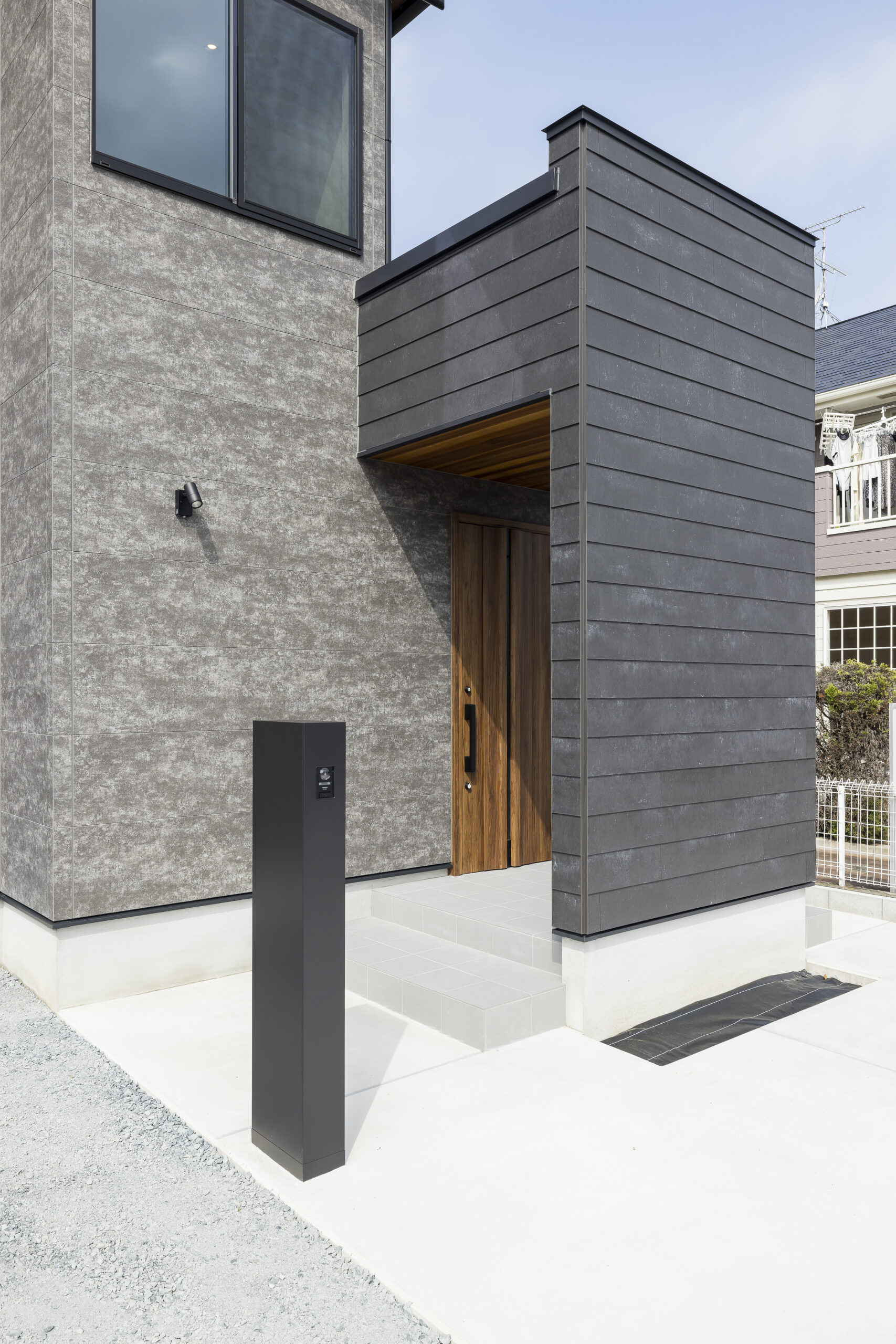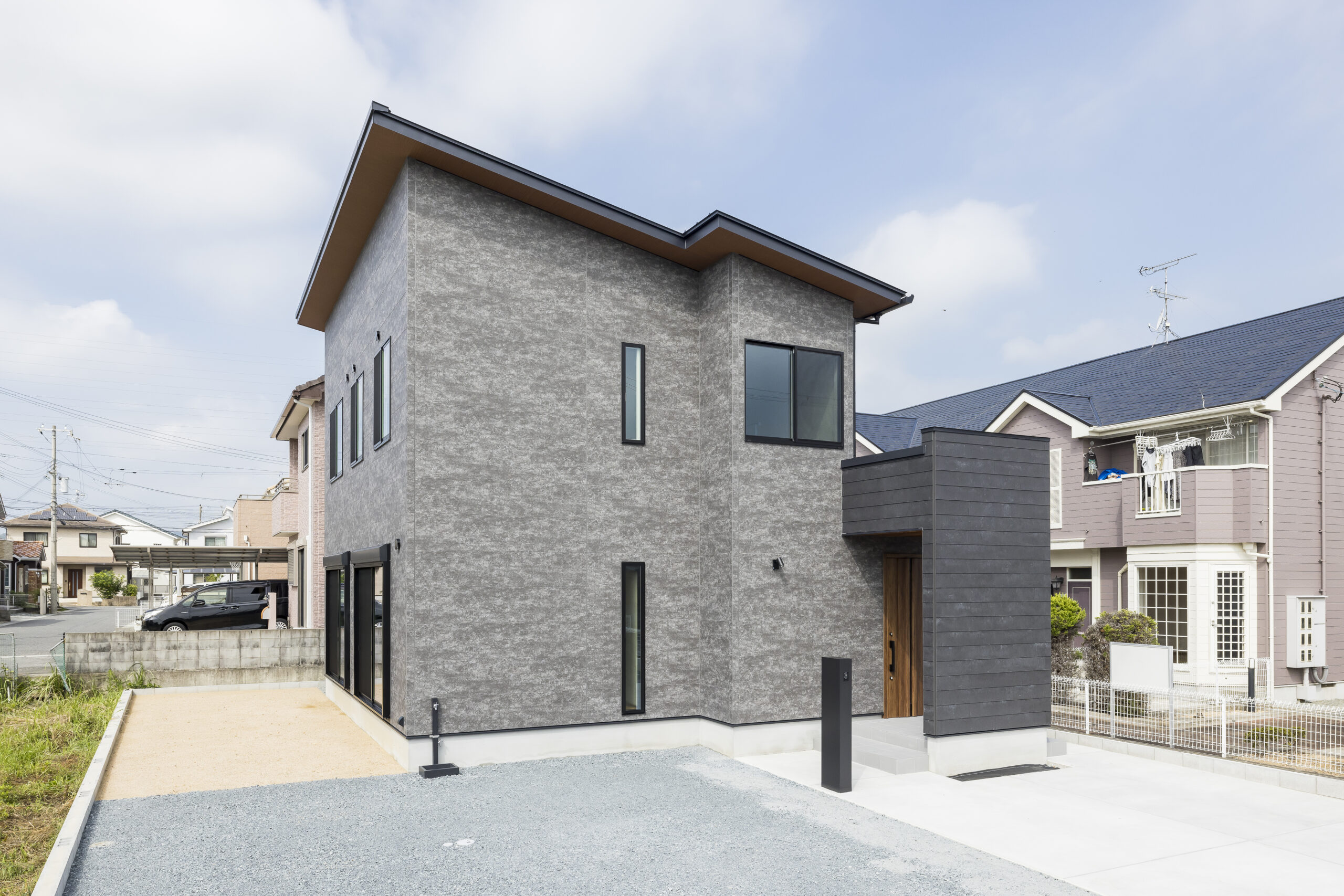 片流れ屋根とグレーの外壁が印象的な、シンプルモダンの住まい。外観は落ち着いた佇まいでありながら、縦長の窓や水平ラインがアクセントとなり、洗練された雰囲気を漂わせています。