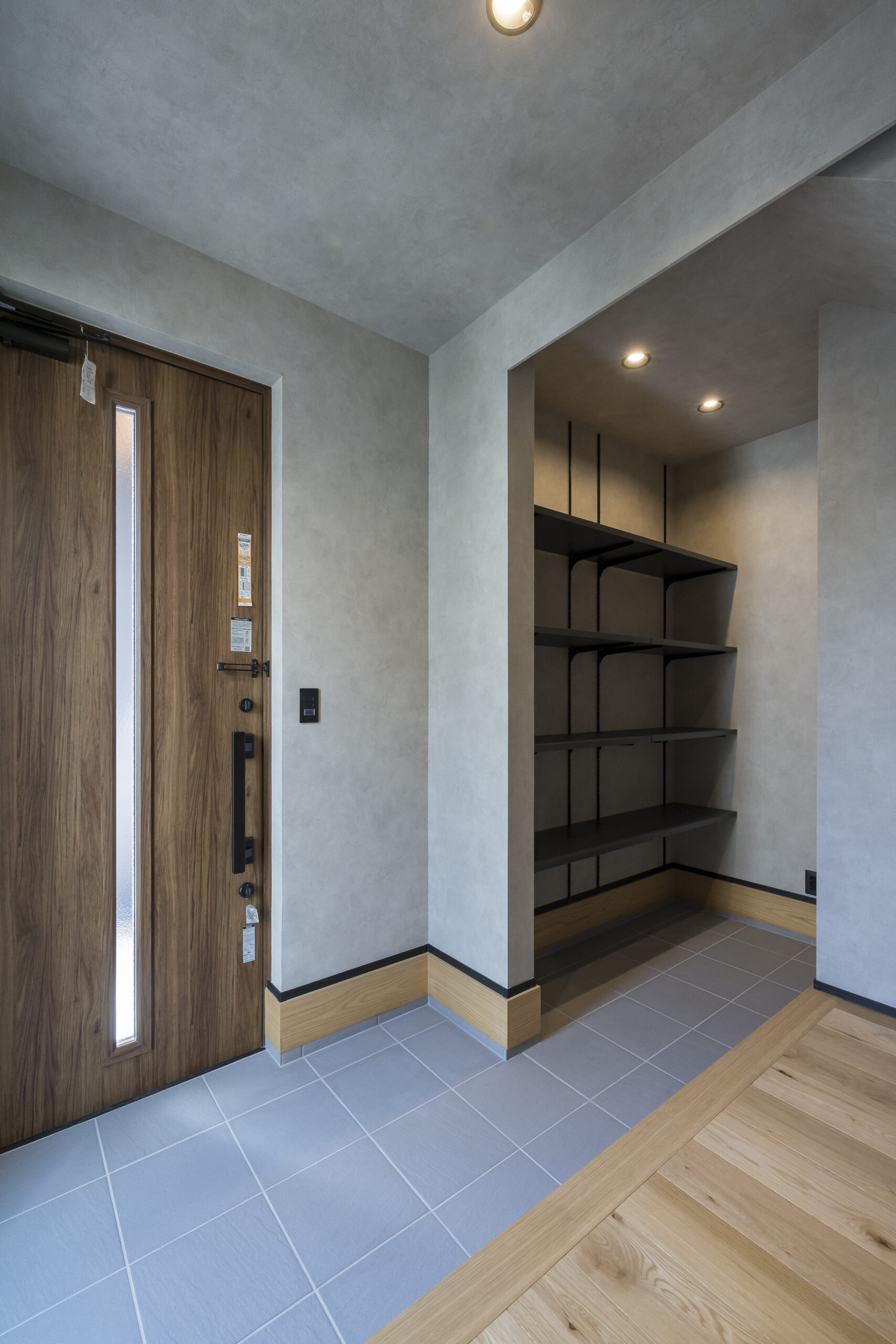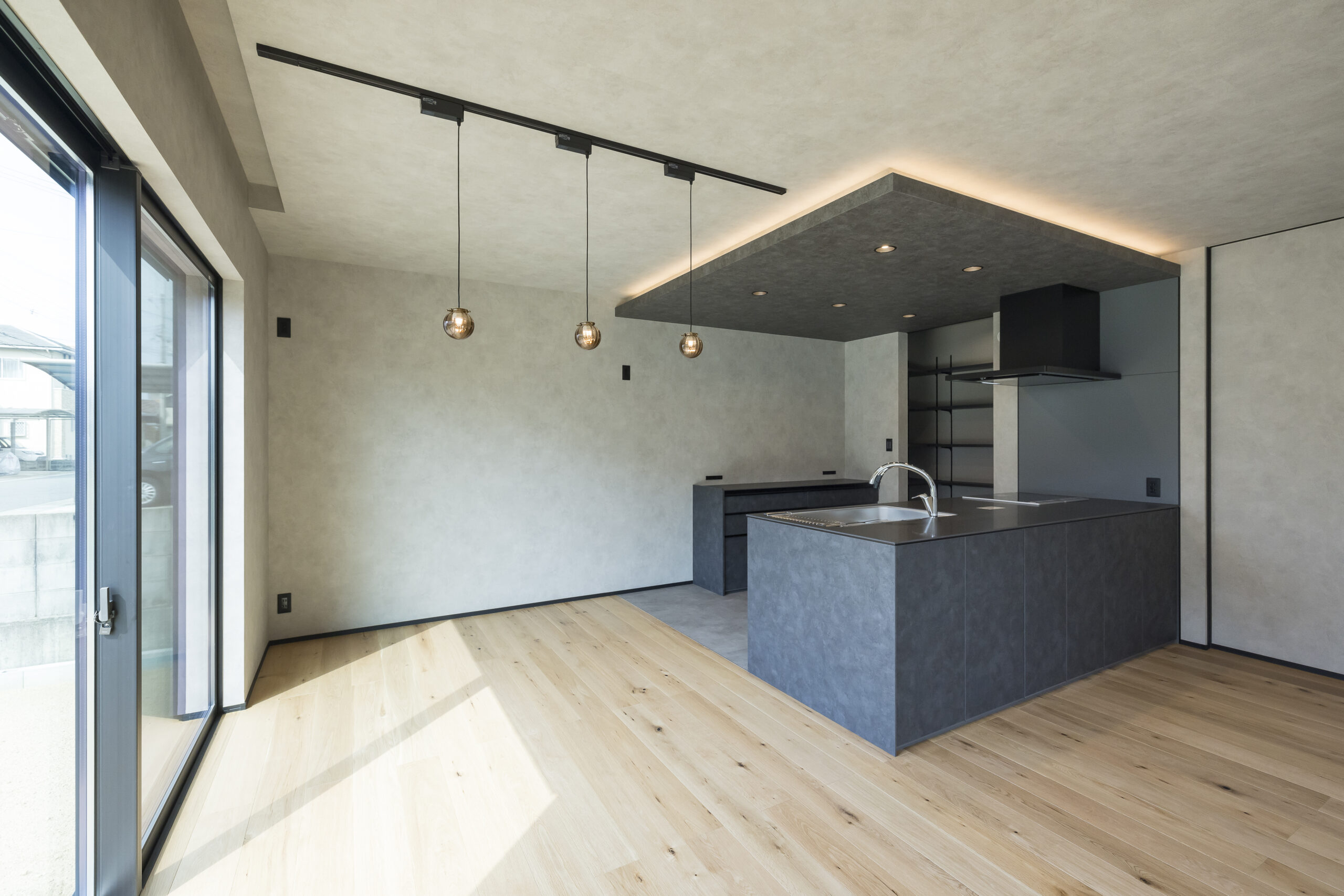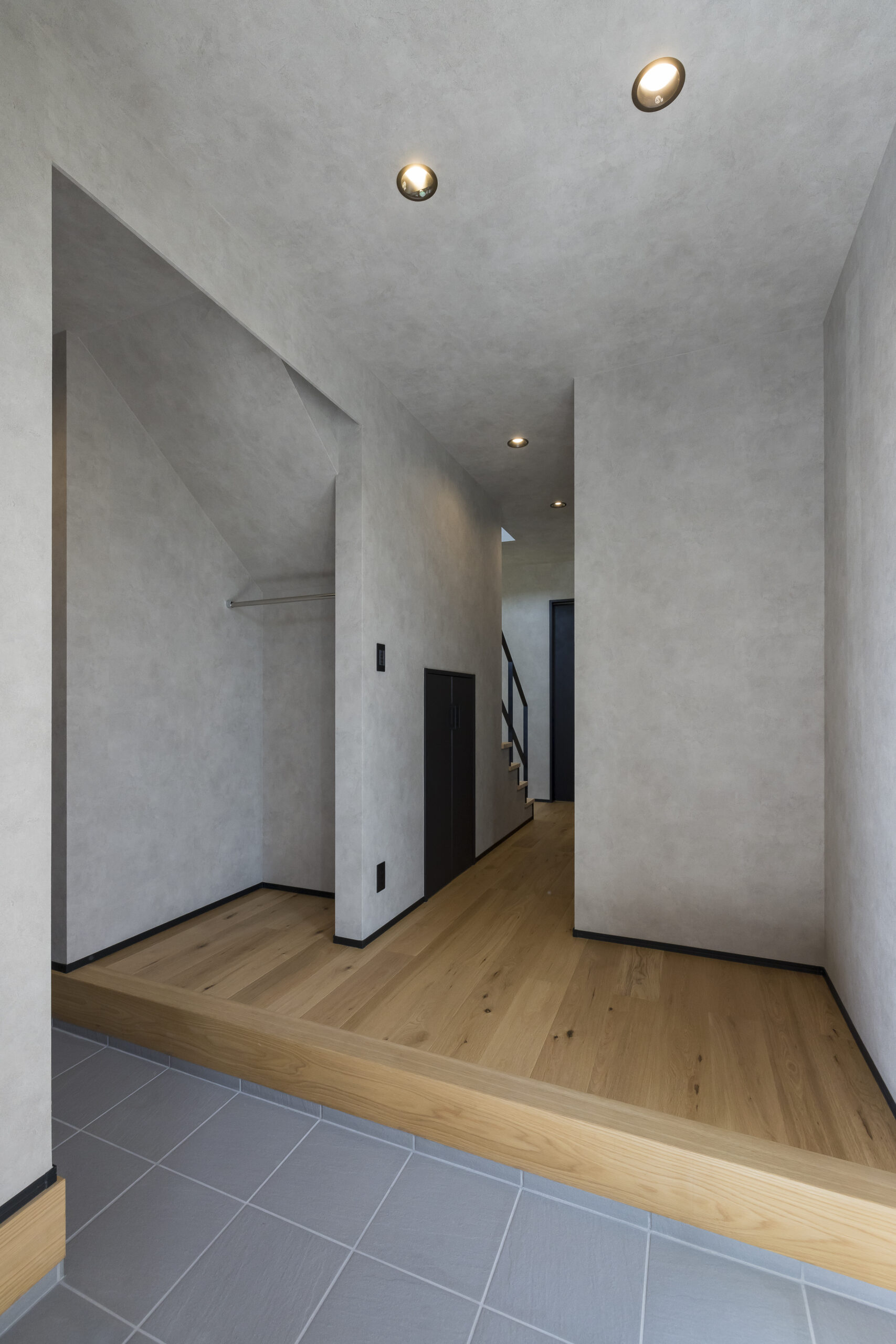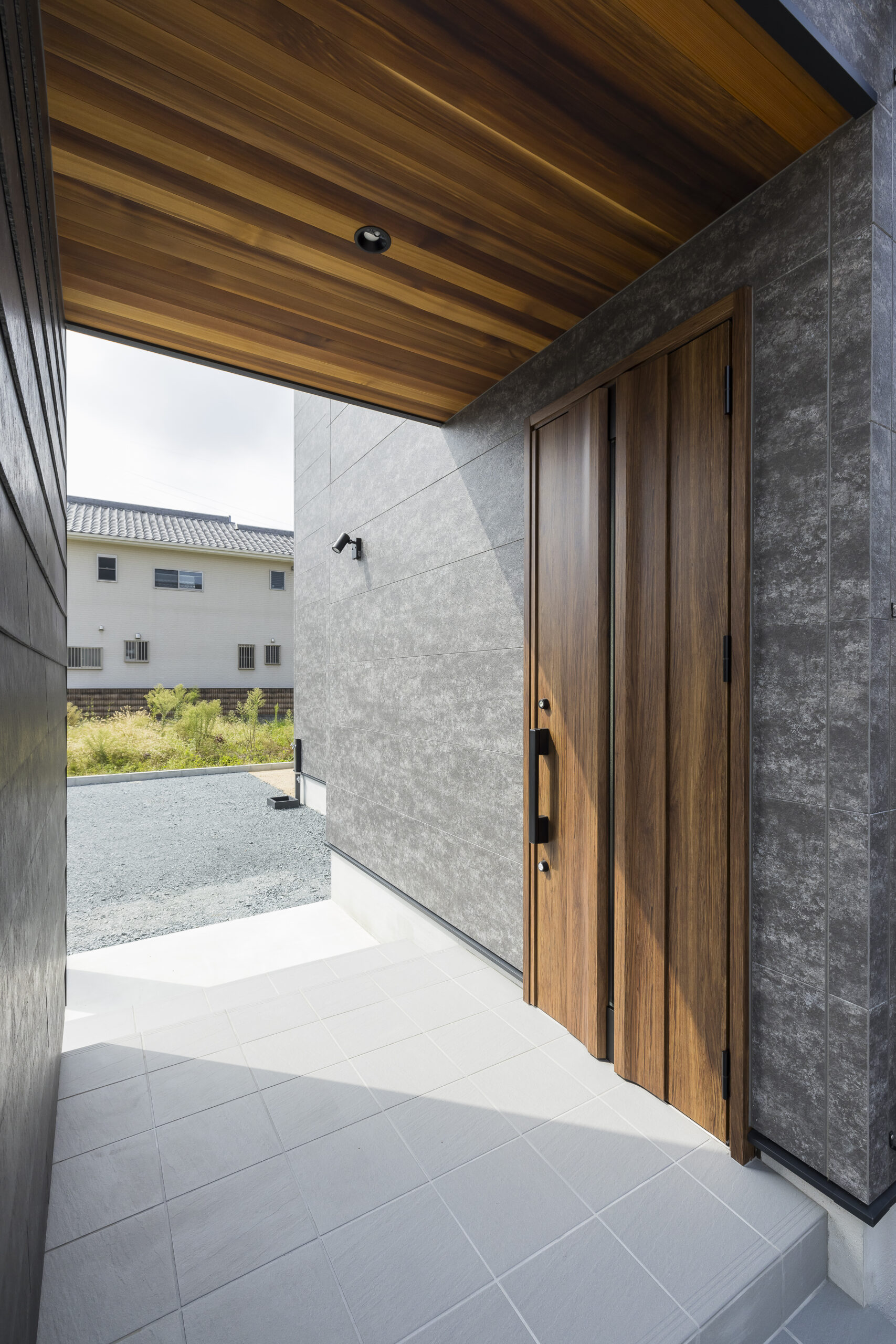 片流れ屋根とグレーの外壁が印象的な、シンプルモダンの住まい。外観は落ち着いた佇まいでありながら、縦長の窓や水平ラインがアクセントとなり、洗練された雰囲気を漂わせています。